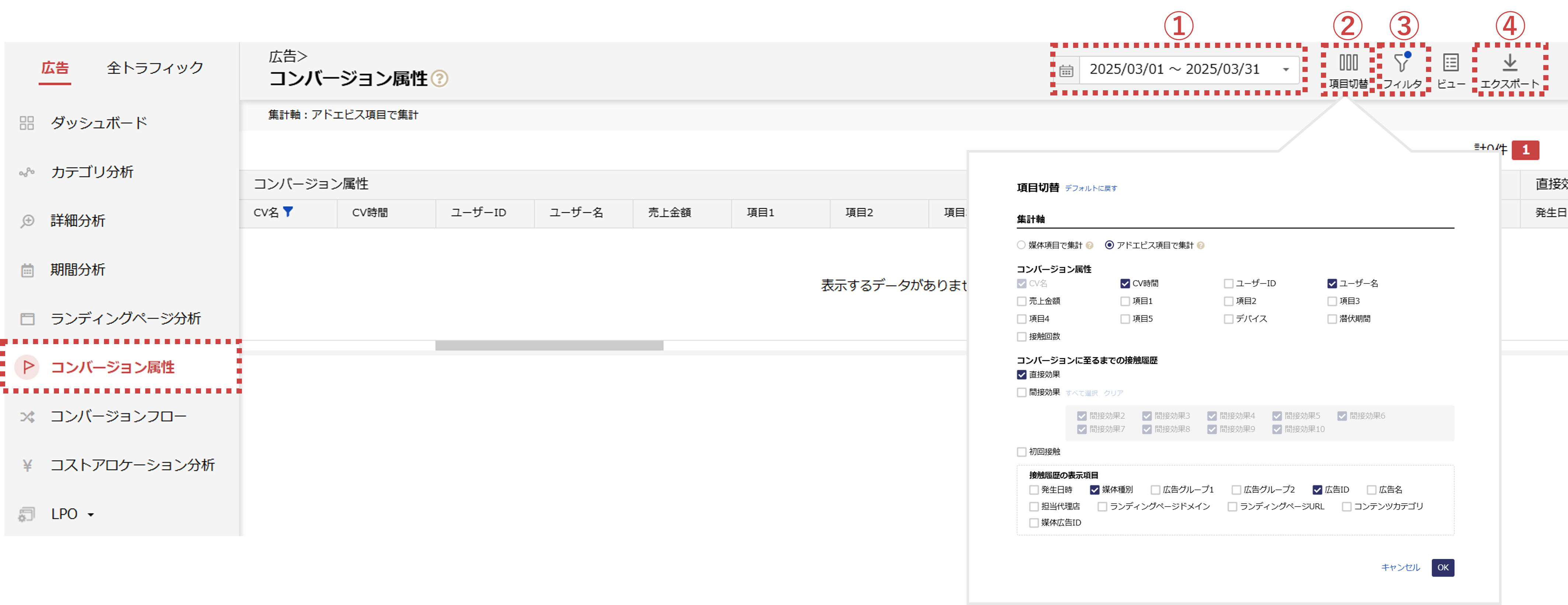 - 「項目切替」から「CV名、CV時間、ユーザー名(会員IDを取得している項目)、直接効果、媒体種別、広告ID」を指定