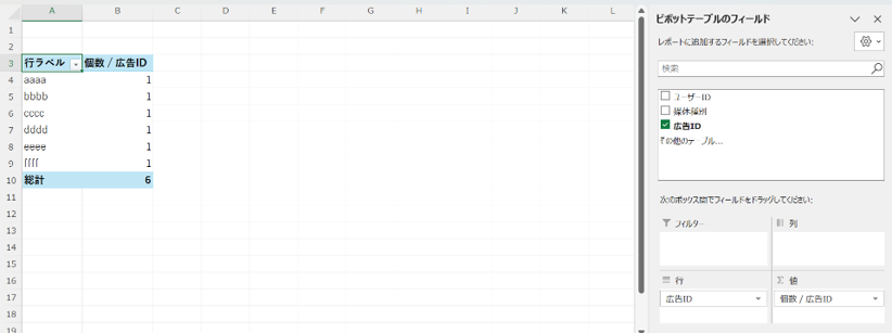 2. [行][値]にドラッグ&ドロップで「広告ID」を入れる。