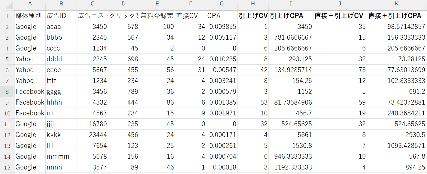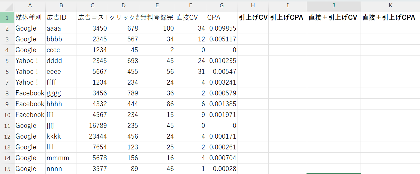 ※引上げCPAも算出したい場合は、[引上げCPA][直接+引上げCPA]のカラムも作成する。