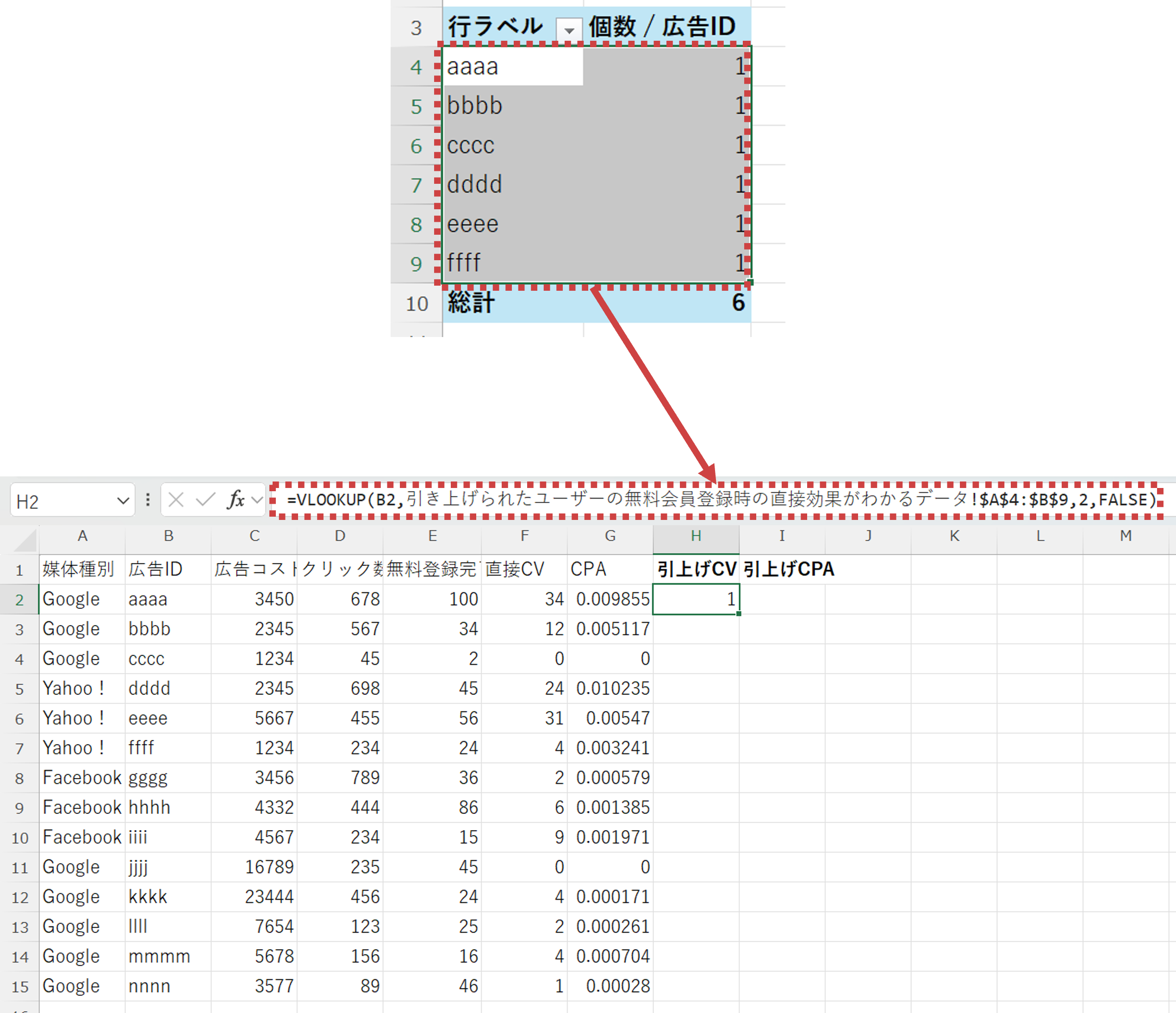 =VLOOKUP(広告IDのセル , 引き上げられたユーザーの無料会員登録時の直接効果がわかるデータの範囲 , その範囲の中で[個数]情報がある列番号 , FALSE)