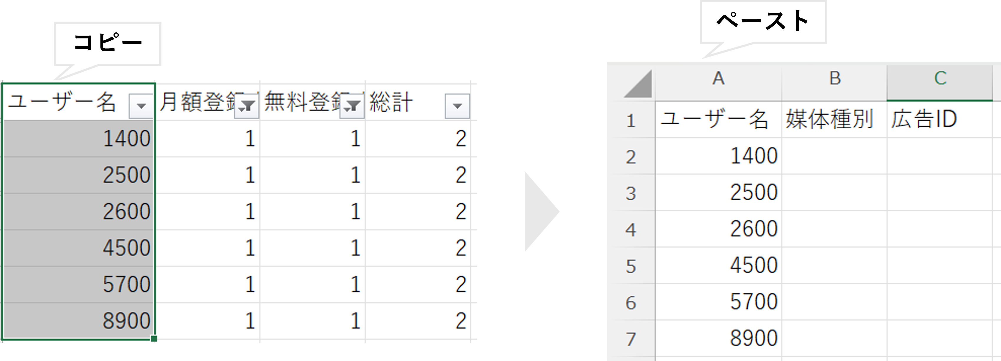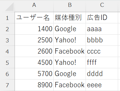 貼り付けたユーザー名の右の列に[媒体種別]と[広告ID]のカラムを作成する。