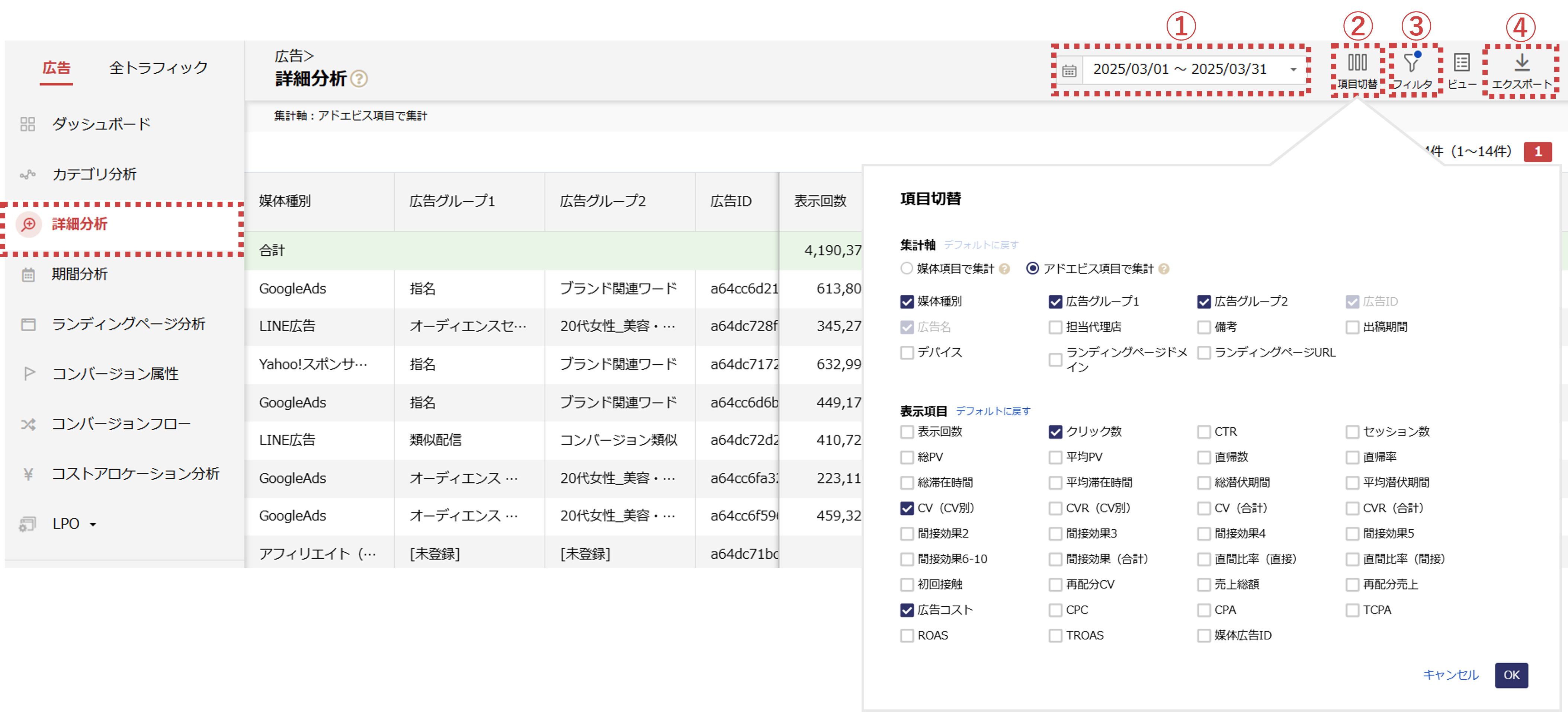 - 「項目切替」から広告IDを含む、レポートにしたい集計軸・表示項目を指定