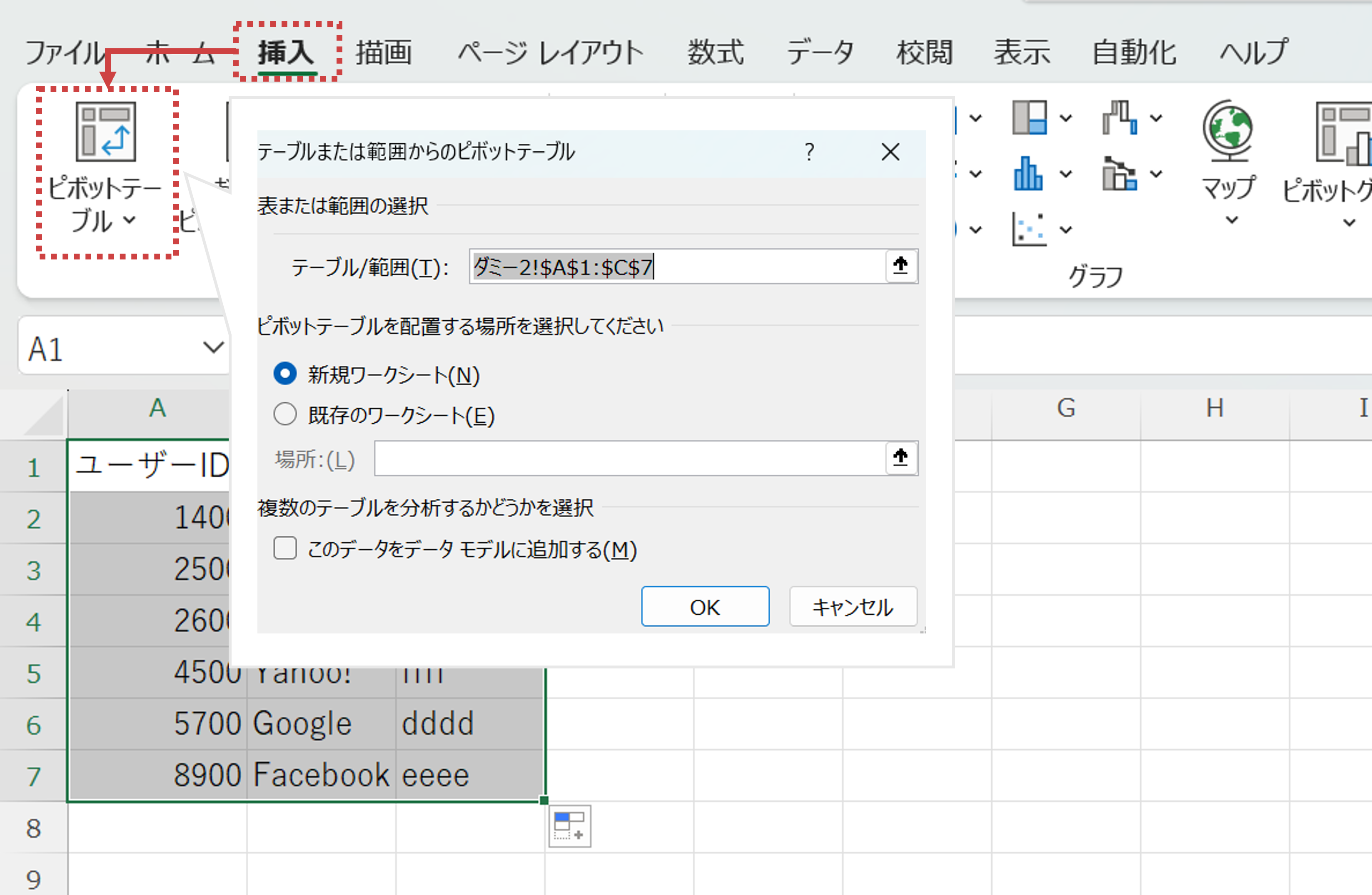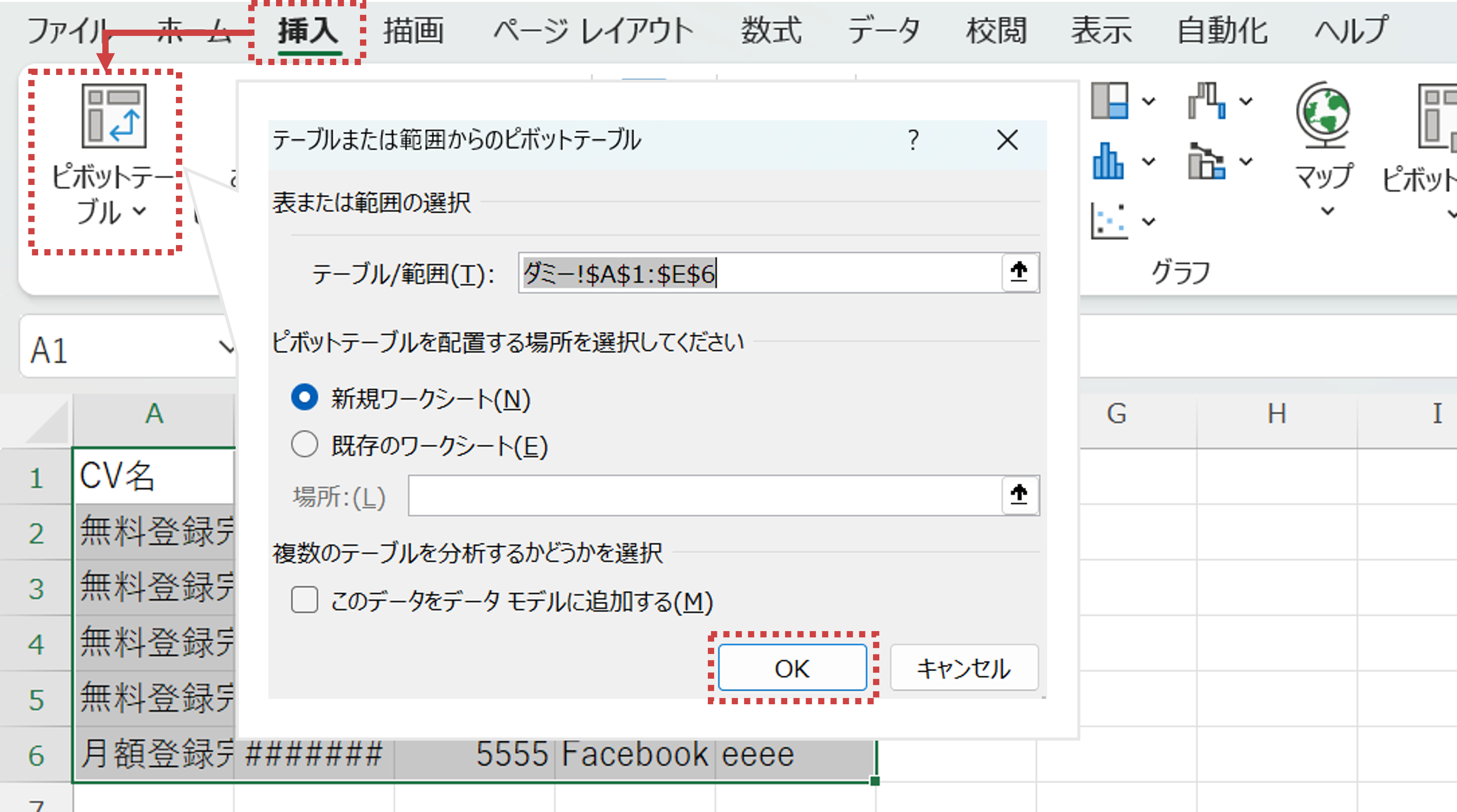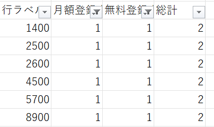 1. (4)で作成した、「引き上げられたユーザーの無料会員登録時の直接効果がわかるデータ」を使ってピポットテーブルを組む。
