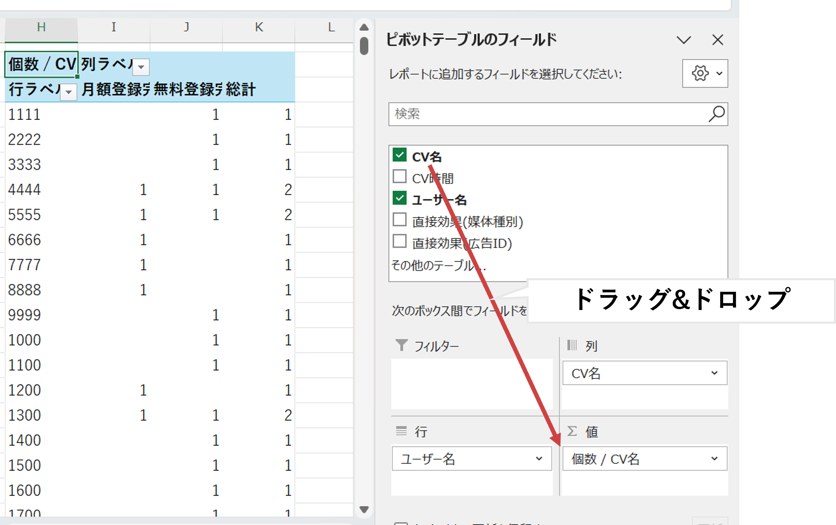※[列]と[値]に「CV名」を入れる際はドラッグ&ドロップをする。