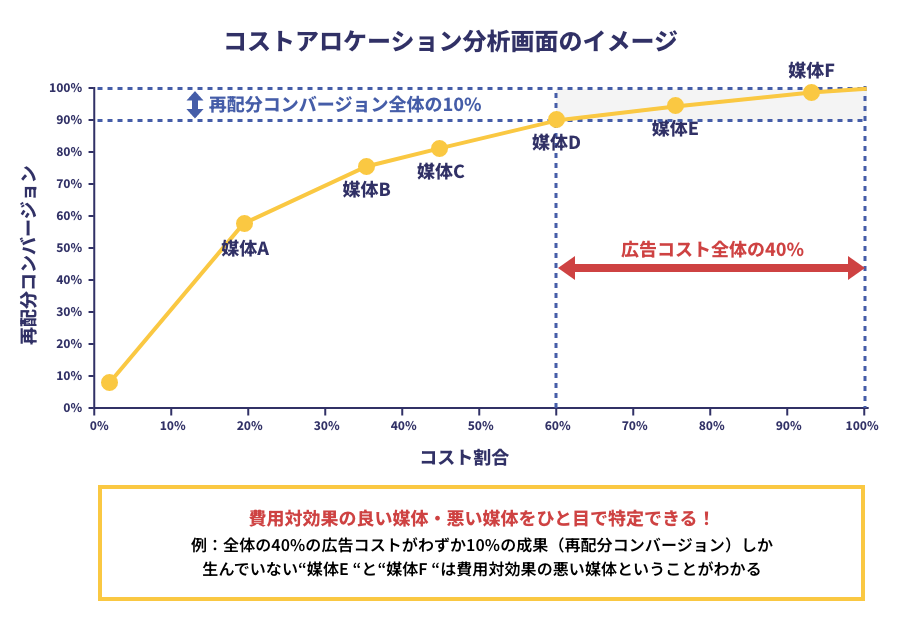 アドエビスの「コストアロケーション分析」では、単に「どの広告で成果が出たか」を見るだけでなく、広告コストに対してどれだけ効率的に再配分コンバージョンを獲得できたかをグラフで把握できます。広告コストの何%を投じて、再配分コンバージョンの何%を獲得しているのかが一目でわかるため、効率の高い施策と見直すべき施策を明確にできます。