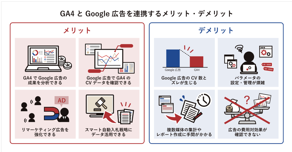 本記事では、GA4とGoogle広告の連携方法、メリットやデメリット、連携後の活用ポイント、Google広告以外の広告媒体の成果を分析する方法まで、網羅的に解説します。
