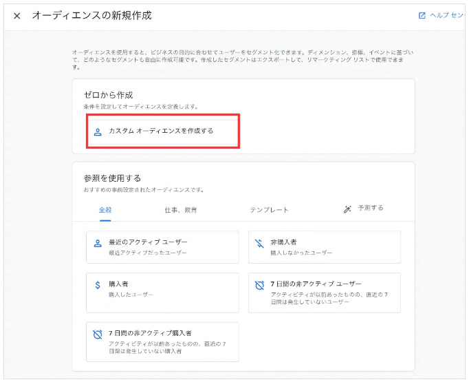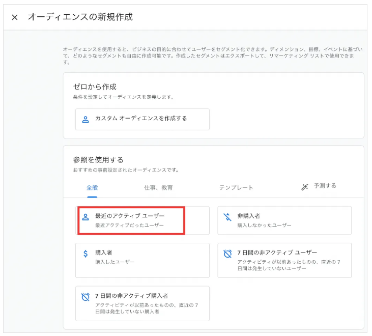 ここでは、「参照を使用する」の「最新のアクティブユーザー」を選択してオーディエンスを作成します。なお、上部の「ゼロから作成」からはカスタムオーディエンスの作成が可能です。カスタムオーディエンスについては、次章「カスタムオーディエンスを作成する」で紹介します。