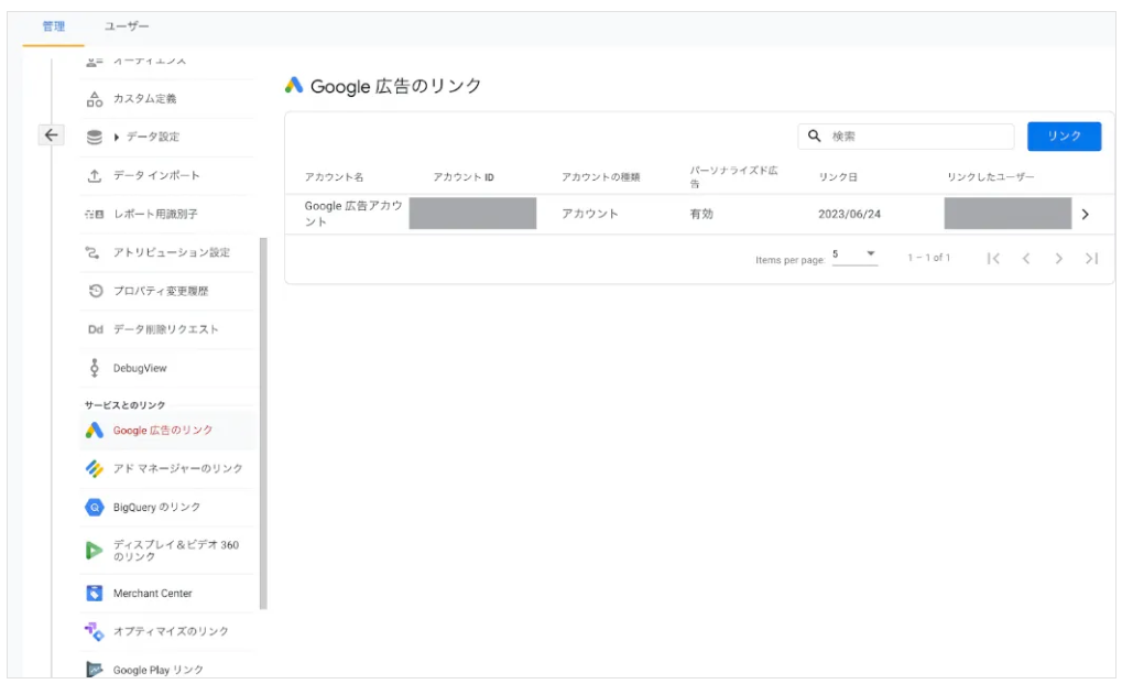 冒頭の「Google広告のリンク」画面に一覧化され、「アカウント名」や「アカウントID」などが表示されます。