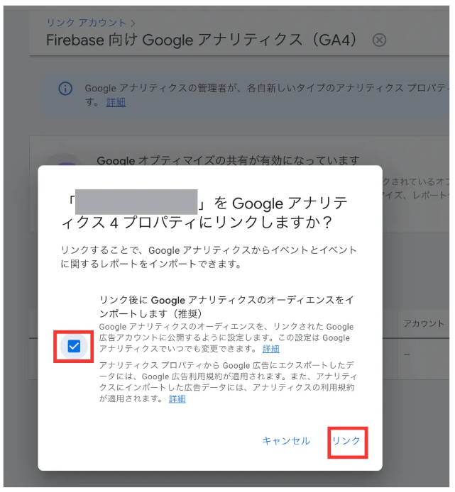Googleアナリティクス4プロパティにリンクするか尋ねるポップアップ画面が表示されるので、「リンク」をクリックします。