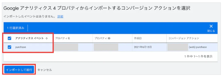 次に、インポートするコンバージョンアクションを選択します。ここでは「purchase」にチェックを入れ、「インポートして続行」をクリックします。