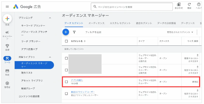 Google広告の管理画面から「ツール」、「オーディエンスマネージャー」を選択し、「アプリ内購入」のカスタムオーディエンスが反映されているか確認します。一覧に追加されていれば、設定完了です。