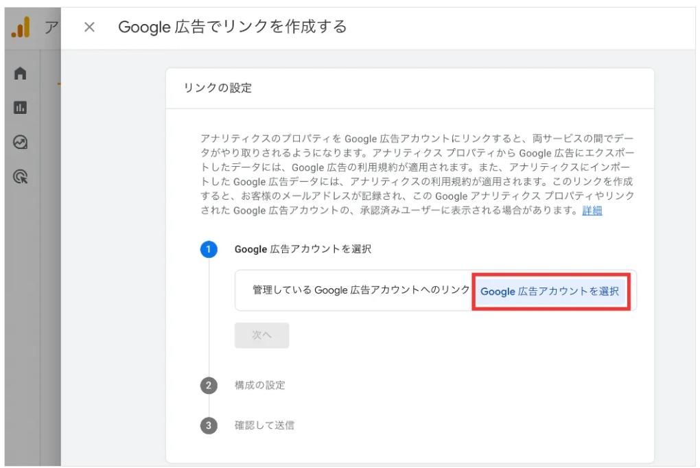 「Google広告でリンクを作成する」という画面が表示されるので、「Google広告アカウントを選択」をクリックします。