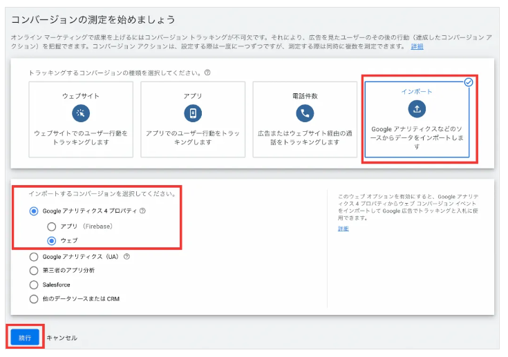 「コンバージョンの測定を始めましょう」と表示された画面から「インポート」をクリックし、「Googleアナリティクス4プロパティ」の「ウェブ」版を選択します。