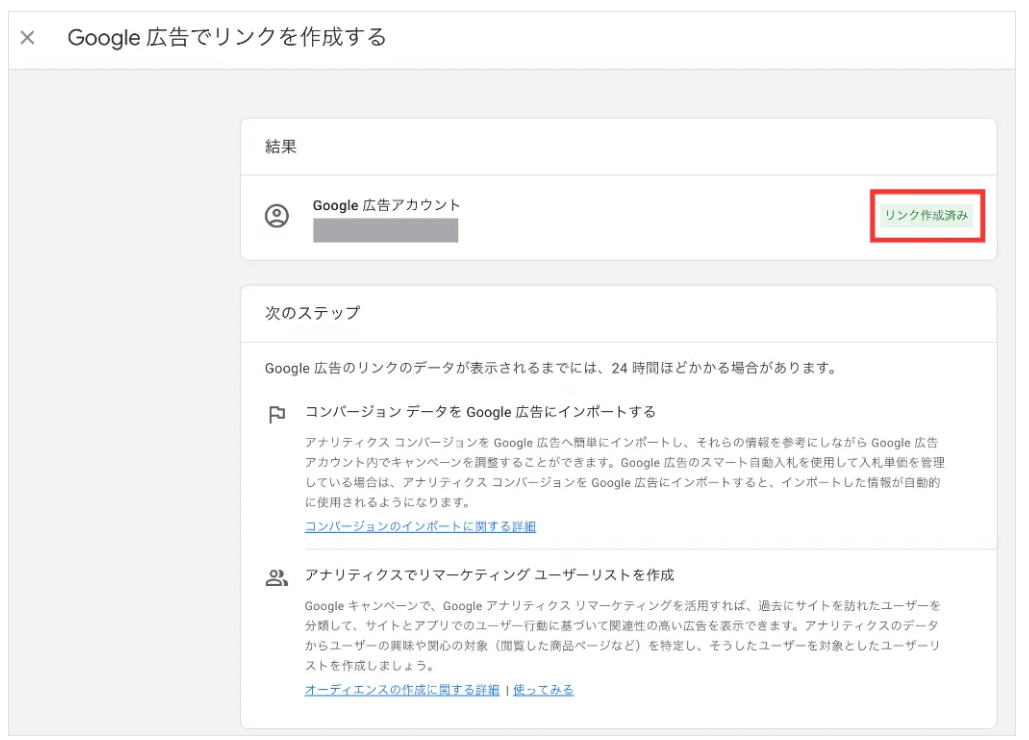 その際、「リンク後にGoogleアナリティクスのオーディエンスをインポートします(推奨)」にチェックを入れましょう。Google広告からGA4のデータを確認できるようになります。