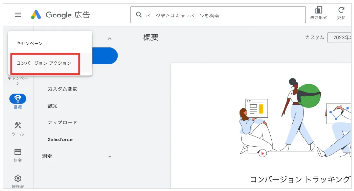 概要画面が表示され、GA4でコンバージョンとして設定したアクションが一覧化されます。以上の設定でキャンペーンなどの目標としてGA4の計測データを利用できるようになります。