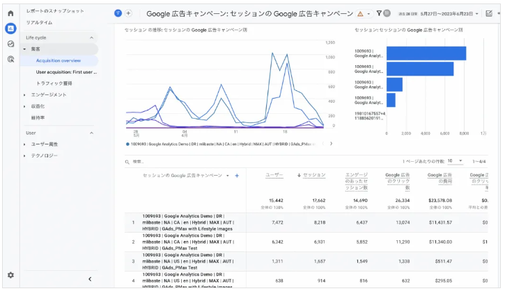 「Google広告キャンペーン」のページが開き、Google広告キャンペーンごとのユーザー数、セッション数などが確認できます。