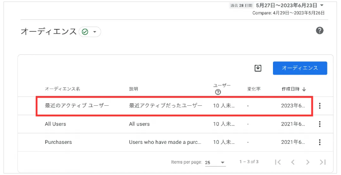 「オーディエンス」画面で一覧化されたら、連携完了です。GA4の計測データに基づく「最近のアクティブユーザー」が確認できるようになります。