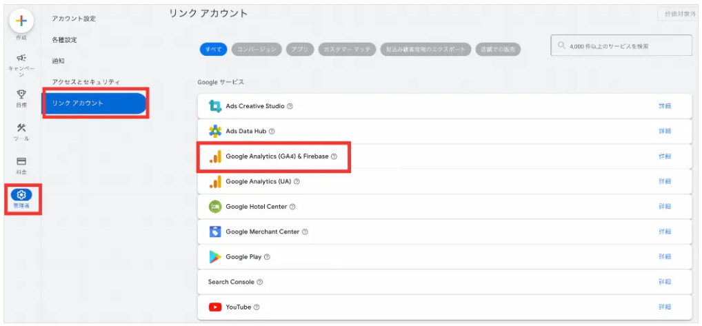 まずは、GA4の管理画面からGoogle広告と連携する手段を紹介します。