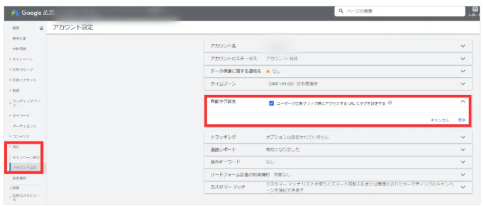 Google広告の管理画面にある「アカウント設定」から「自動タグ設定」を選択します。「ユーザーが広告クリック時にアクセスするURLにタグを設定する」にチェックを入れ、「保存」をクリックすると完了です。