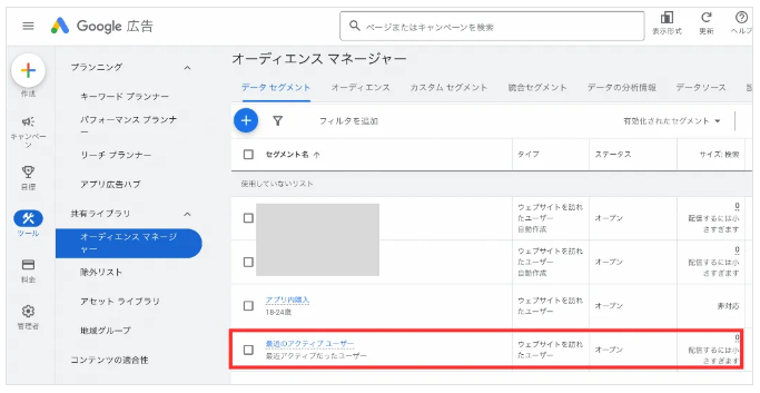 Google広告にログインし、「ツール」から「オーディエンスマネージャー」を開きます。「データセグメント」のタブの下部にオーディエンスの一覧があり、「最近のアクティブユーザー」が反映されていると確認できます。これでGoogle広告の配信に、GA4のデータ利用が可能となりました。
