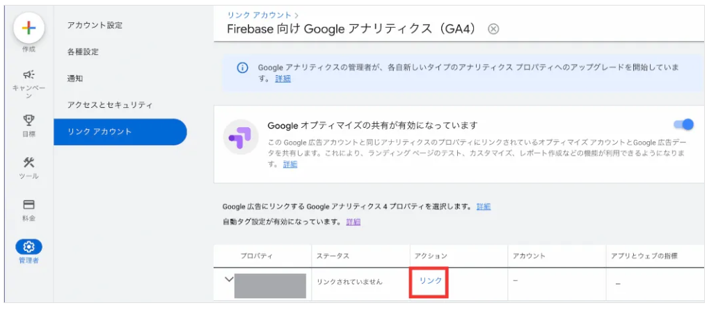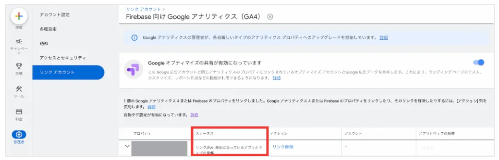 左下の「管理者」から「リンクアカウント」を開き、「Google Analytics(GA4) & Firebase」の詳細を開きます。
