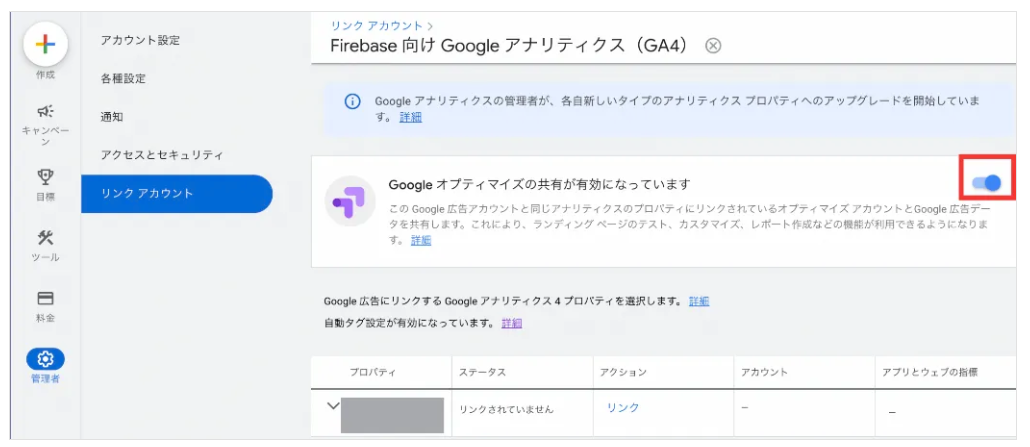 「Firebase向けGoogleアナリティクス(GA4)」の詳細ページが開くので、「Googleオプティマイズの共有が有効になっています」をオンにします。