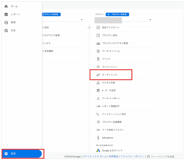 GA4の左下に表示される「管理」をクリックし、「オーディエンス」を選択します。