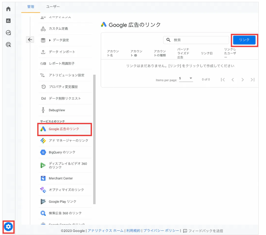 左下の「管理」から「Google広告のリンク」を選択して、右上に表示される「リンク」をクリックします。