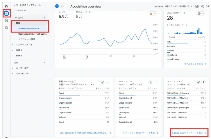 GA4の「レポート」から「集客」内の「Acquisition overview」を開きます。「セッション」のカード下部にある「Google広告キャンペーン表示」を選択します。