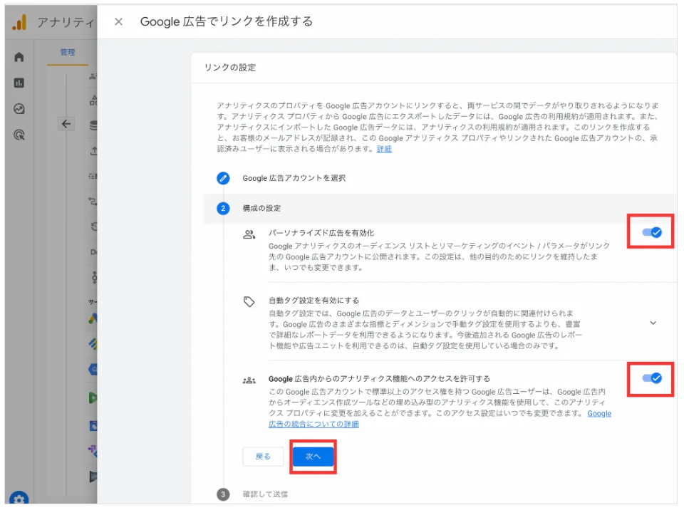 「構成の設定」内の「パーソナライズド広告を有効化」と「Google広告内からのアナリティクス機能へのアクセスを許可する」が有効になっているか確認し、「次へ」を押します。