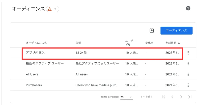 オーディエンスの一覧に、「アプリ内購入」が含まれたことを確認します。