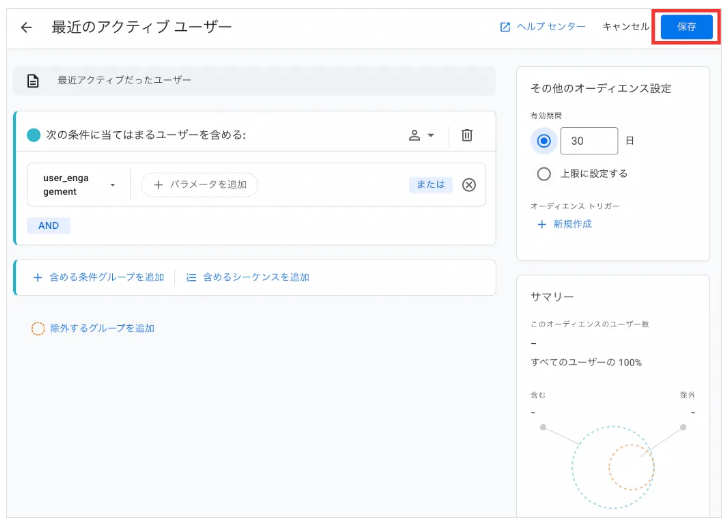 「最近のアクティブユーザー」の設定画面で、ユーザーの条件を設定します。ここでは、「user-engagement」と設定し、右上の「保存」を押します。
