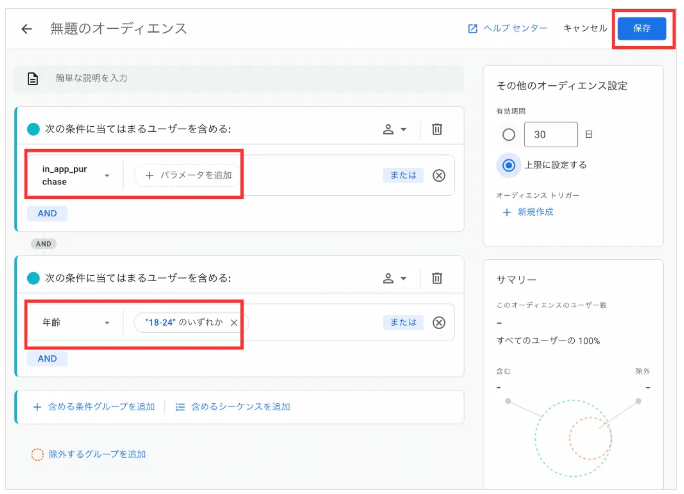 次に、条件を入力します。ここでは「in_app_purchase(アプリ内購入)」と「年齢(18-24)」を設定しています。入力後、右上の「保存」をクリックします。