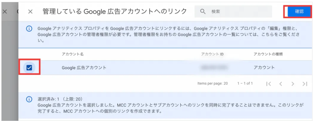 「Google広告アカウント」にチェックを入れて、「確認」ボタンを押します。