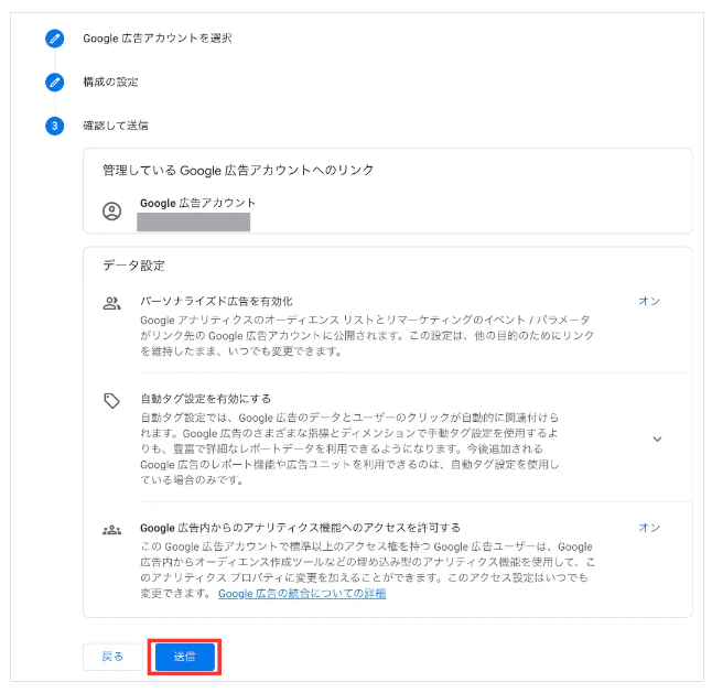 管理しているGoogle広告アカウントと「データ設定」を確認し、「送信」ボタンをクリックします。