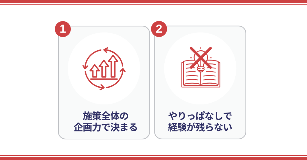 - 振り返りが仕組み化されておらず、成果や課題の評価が属人的になるため、明確な改善策が見えないまま次の施策に進んでしまう