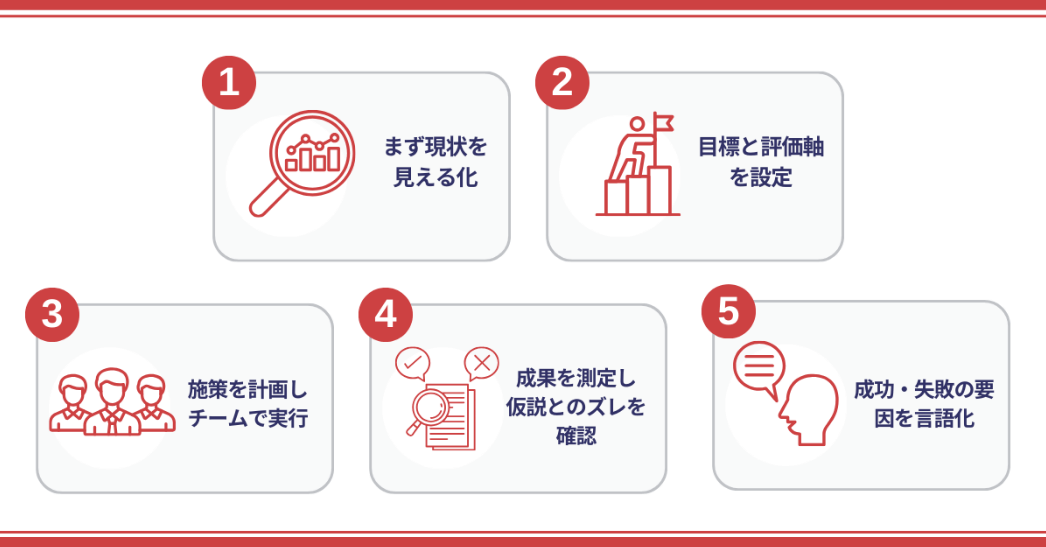 施策の「仮説→実行→効果→学習→改善」の流れを繰り返し、うまくいった方法や失敗から学んだことを蓄積し会社全体で共有・活用します。