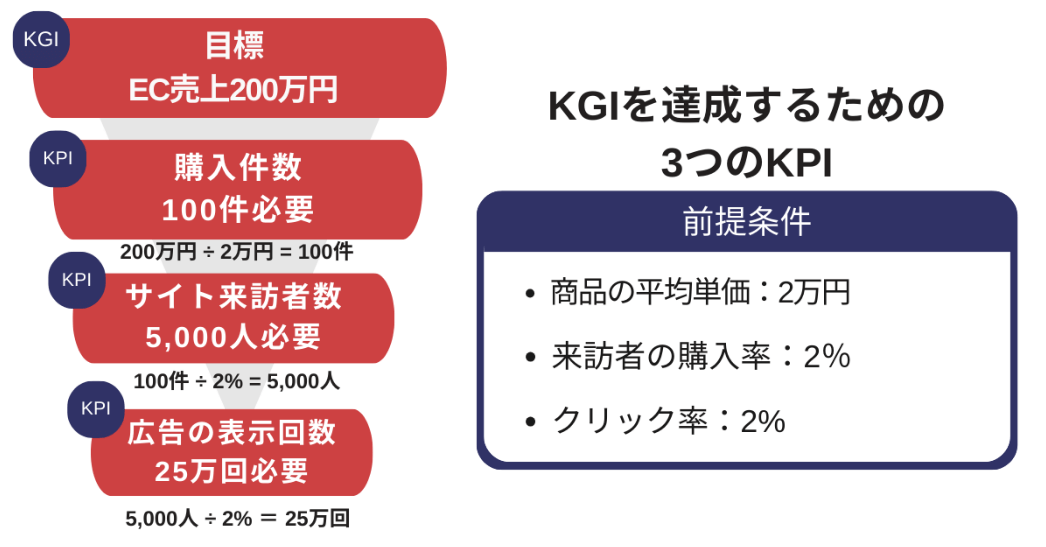 ポイントは、「新規リードを300件獲得する」「ECサイトの月間売上200万円」といった、明確な数値で目標を立てることです。例えばKGIが「EC売上200万円」であれば、以下のように考えます。