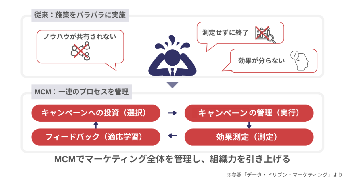マーケティング・キャンペーン・マネジメント(MCM=Marketing Campaign Management)とは、施策ごとの成果やユーザー反応などのデータをもとに、計画・実行・振り返り・改善のプロセスを一貫して管理し、マーケティング成果を再現性ある形で積み上げていく戦略的な運用アプローチです。