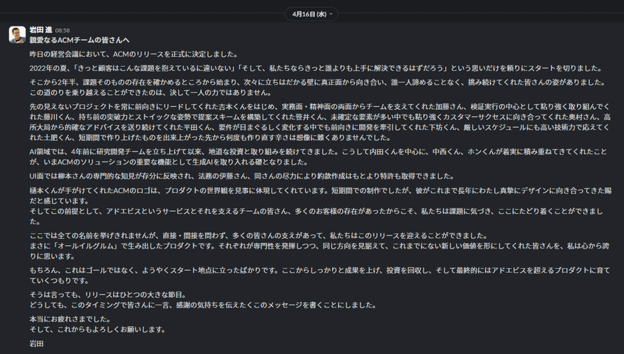 そして、この間の投資は当社にとって決して小さくないものでした。既存事業への投資を抑える形にもなっていました。新規事業に挑んだ仲間がいた一方で、既存事業を担う仲間たちもまた、不安や戸惑いを抱えてもおかしくない状況だったと思いますが、誰ひとり弱音を吐かず、それぞれが役割を理解し、新しいサービスを組織全体で支え育んでくれました。