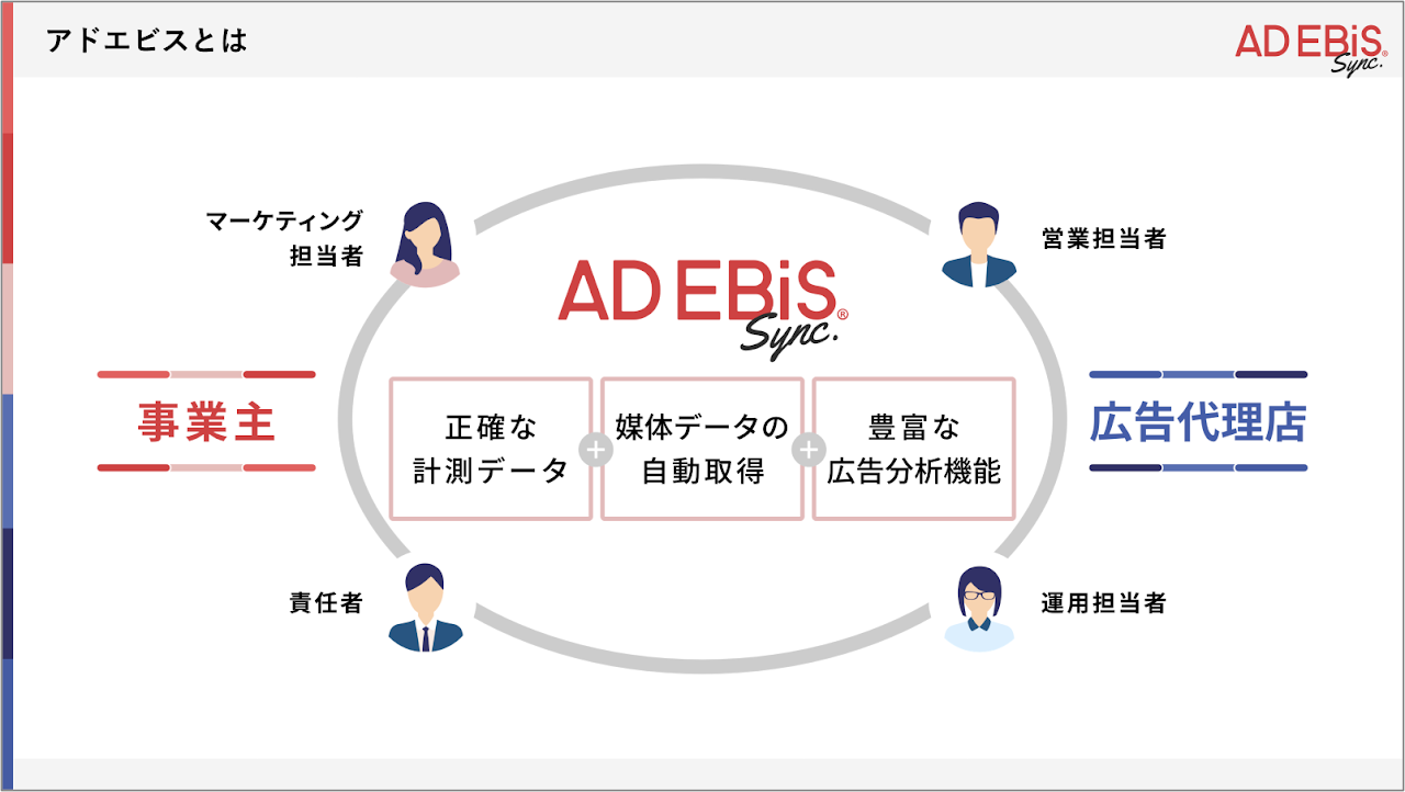 アドエビスは、高精度な独自の計測データに加え、媒体から表示回数やコスト情報を自動取得することで、"今"の広告効果を正確に把握できるツールです。関係者間での共有を速やかに行える環境が、より最適な次の一手のご検討を支援いたします。