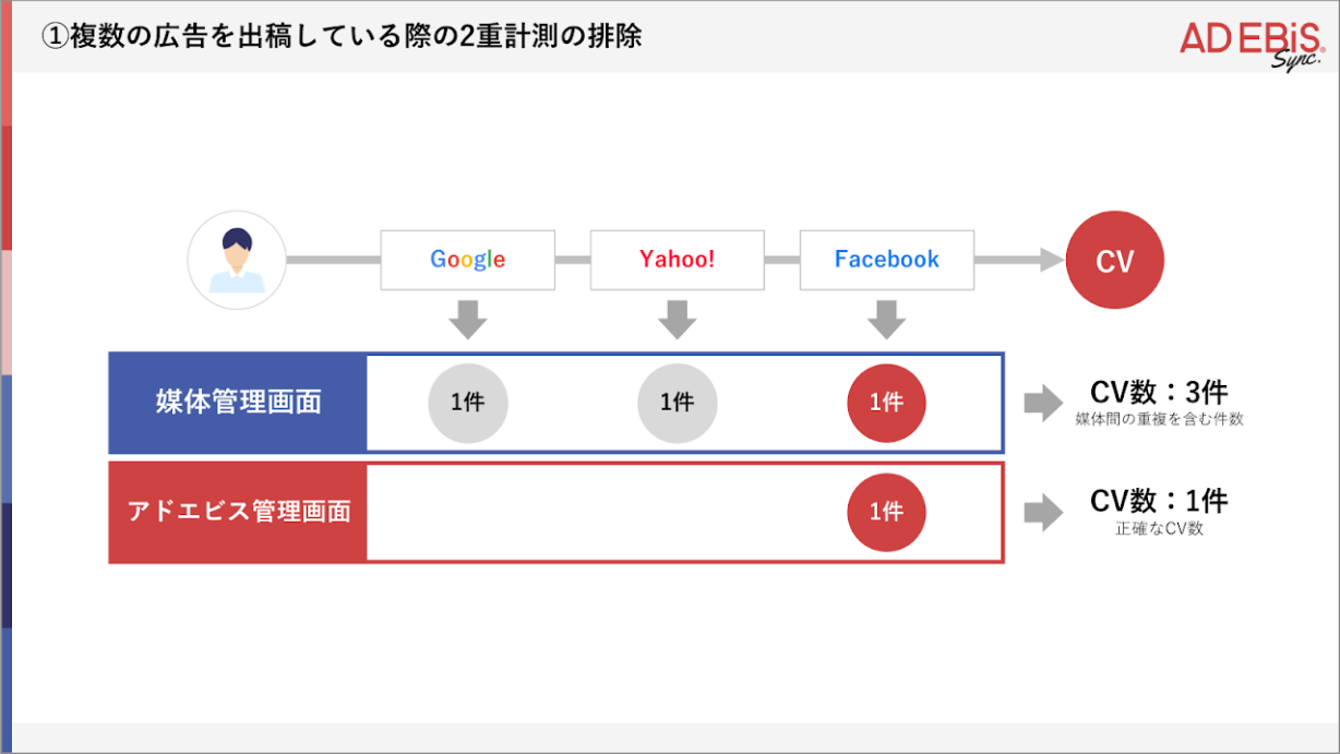 「Google広告で1コンバージョン」「Yahoo!広告で1コンバージョン」とそれぞれの管理画面上でコンバージョンが計測され、各媒体のコンバージョン数を合計すると3コンバージョンとなります。