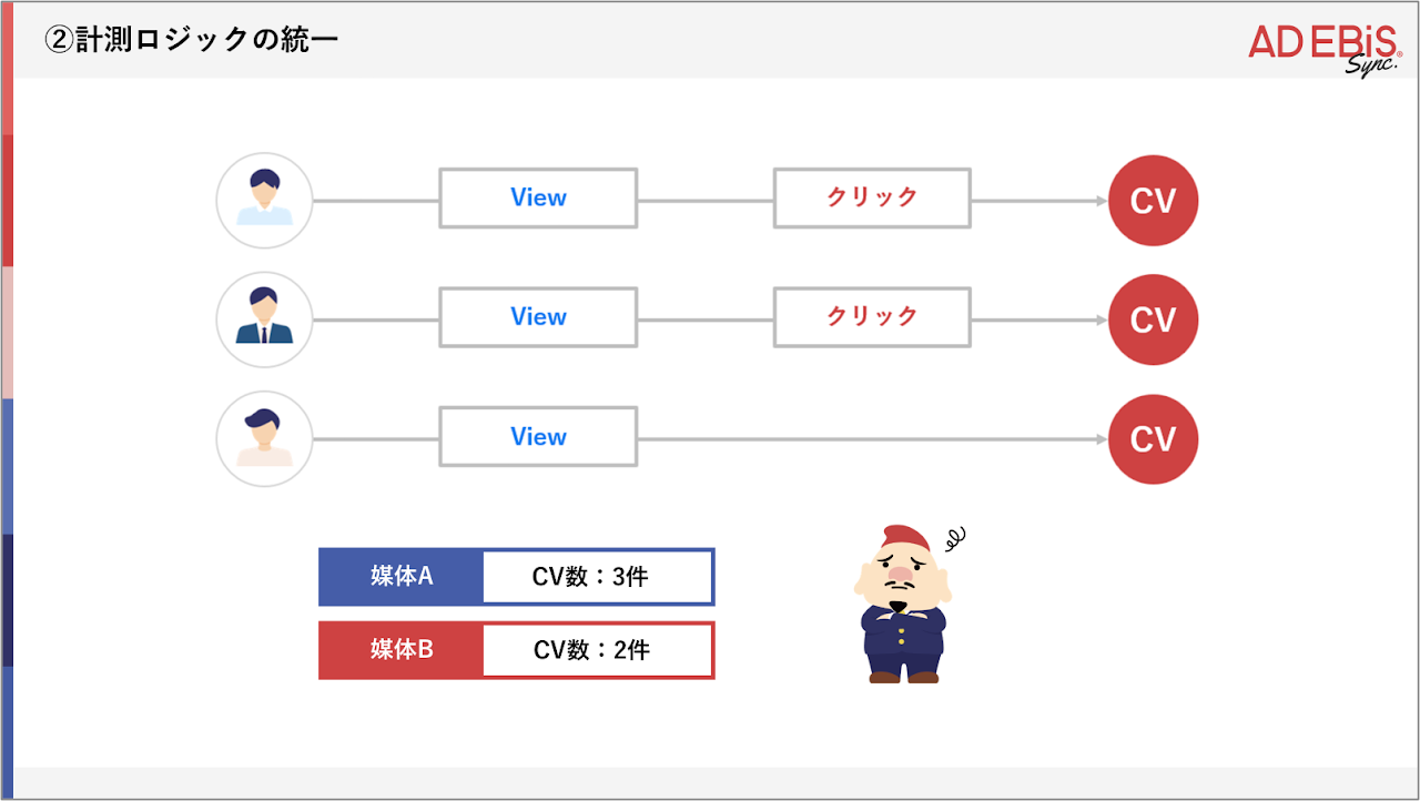 例)媒体Aは、ビュースルーコンバージョンもコンバージョンとしてカウントします。媒体Bではクリックスルーコンバージョンのみをカウントします。