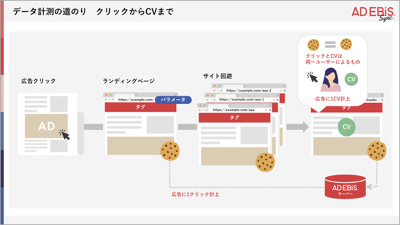 アドエビスでは、タグ・Cookie・パラメータを用いて広告の成果を計測します。