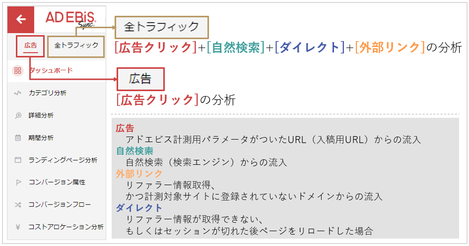 アドエビス管理画面には「広告」と「全トラフィック」の2種類のタブがあります。
