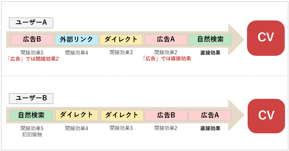 ユーザーが以下のような遷移をした場合、「全トラフィック」では自然検索にコンバージョン(直接効果)がつきますが、「広告」では広告のみのデータで集計をするため広告Aにコンバージョン(直接効果)がつきます。